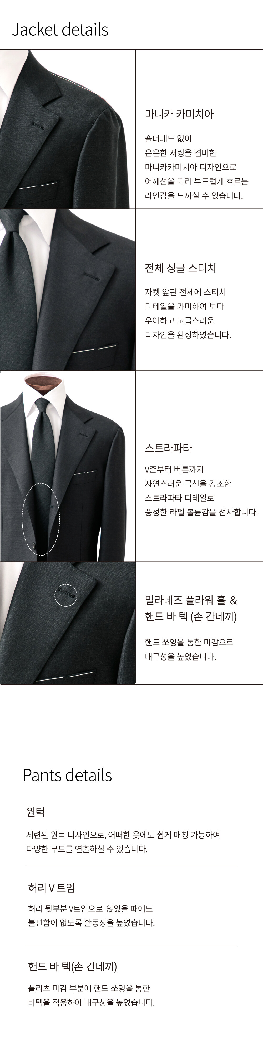 [DETAILS] 자켓 - CM 나폴리#8 패턴 - 반 비접착 (하프 캔버스) - 3 roll 2 (스트라파타) - 마니카 카미치아 - 밀라네즈 플라워 홀 - 플랩 포켓 - 사이드 벤트 - 풀 스티치 - 풀 라이닝 - 소매 전용 안감 적용 - 핸드 바 텍 (손 간네끼) - Fabric : ITALY ARISTON / 280g - Wool 100%
