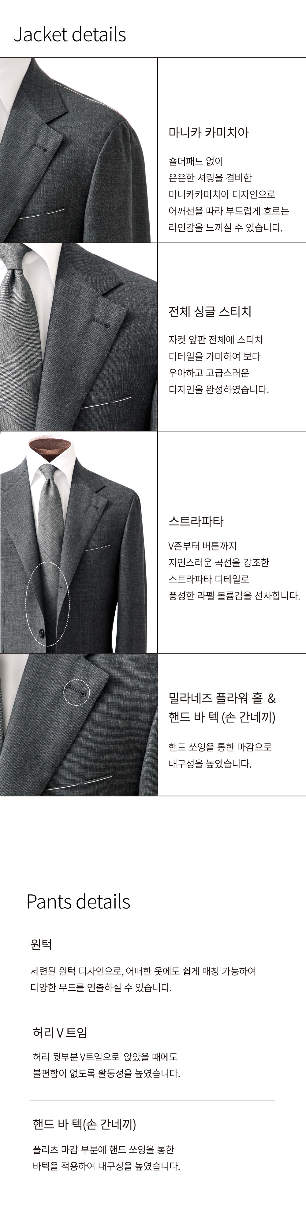 [DETAILS] 자켓 - CM 나폴리#8 패턴 - 반 비접착 (하프 캔버스) - 3 roll 2 (스트라파타) - 마니카 카미치아 - 밀라네즈 플라워 홀 - 플랩 포켓 - 사이드 벤트 - 풀 스티치 - 풀 라이닝 - 소매 전용 안감 적용 - 핸드 바 텍 (손 간네끼) - Fabric : ITALY ARISTON/ 280g - Wool 100%