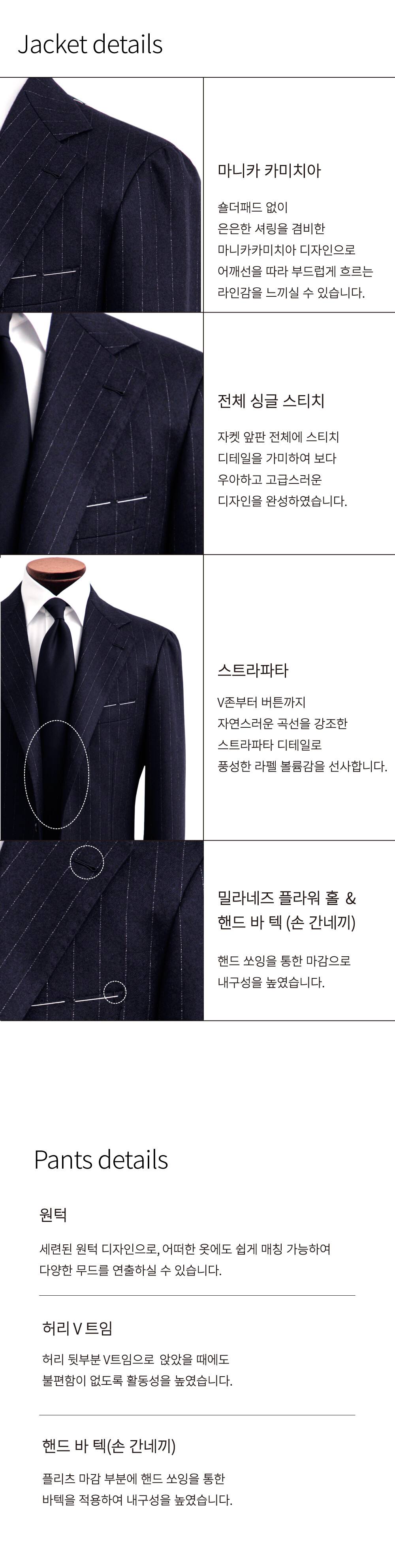 [DETAILS] 자켓 - CM 나폴리#9 패턴 - 반 비접착 (하프 캔버스) - 3 roll 2 (스트라파타) - 마니카 카미치아 - 밀라네즈 플라워 홀 - 제티드 포켓 - 사이드 벤트 - 풀 스티치 - 풀 라이닝 - 소매 전용 안감 적용 - 핸드 바 텍 (손 간네끼) - Fabric : ITALY REDA 340g - Wool 100% (Soft flannel)