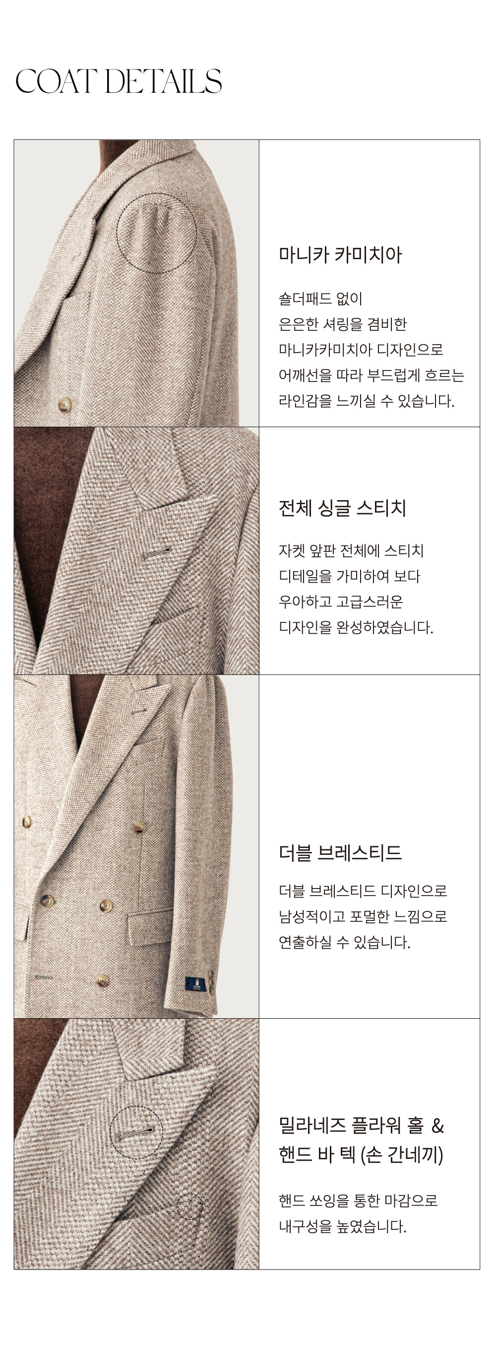 클래식마켓의 22FW RTW 컬렉션 작품(作品)들은 단 한 명의 장인이 핸드 쏘잉으로 작업한 밀라네즈 홀과 핸드 바텍으로 비로소
